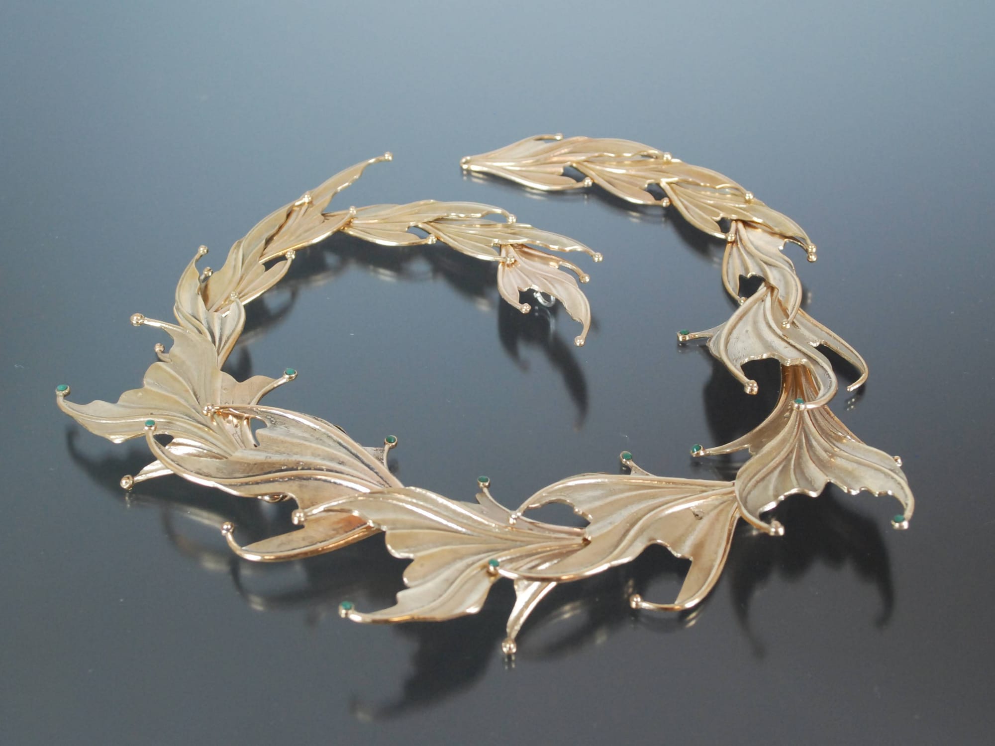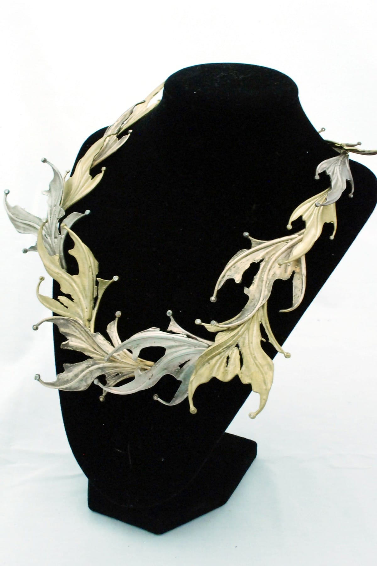 We were assigned a project to design a linkage necklace; a style where each unit of the necklace attached directly to its neighbors, without being threaded like a bead or joined via chain or rings. We could use no more than 3 or 4 pieces - we would need to mold and cast each piece several times, and link them together. This was probably the final project for the casting class.